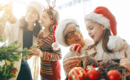 Merry Christmas and Happy Holidays. Granny, mom and daughters near the tree indoors. The morning before Xmas. Portrait of loving family.