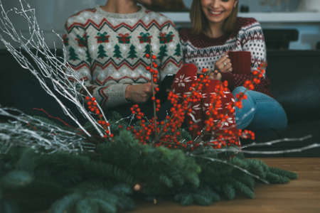 Cropped view of young woman and man are enjoying Christmas time using technology wearing Christmas sweaters sitting on a sofa at home