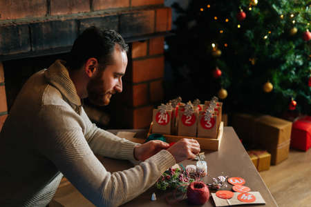 Handsome young man writing number on red bag making paper bags from kraft paper for advent calendar on Christmas Eve sitting by fireplace and tree. Preparing for xmas, new year and winter holidays.