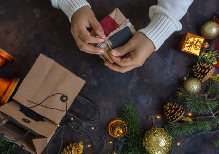 Budget christmas gifts, Cheap Christmas presents, Inexpensive Xmas. Gift Ideas for a Tight Christmas Budget. Cardboard box with packaging kraft paper and one gift