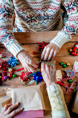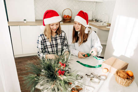 Two charming sisters tie cookies with a ribbon, pack Christmas gifts. Preparation for the holidays, gifts, sweet treats