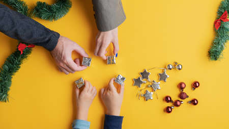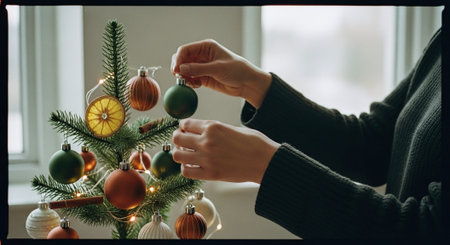 The picture of the family member is setting up holiday decorations, with the focus on their hands and the festive decor of christmas holiday, creating warm atmosphere with home cozy lighting. AIG43.