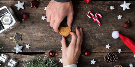 A couple placing holiday cookie with word Love on it on rustic wooden desk full of christmas decorations.