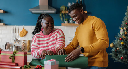 Young African couple looking happy while wrapping Christmas gifts in colorful paper at home