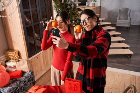 Funny man and woman showing tangerines to the camera while making selfie at home