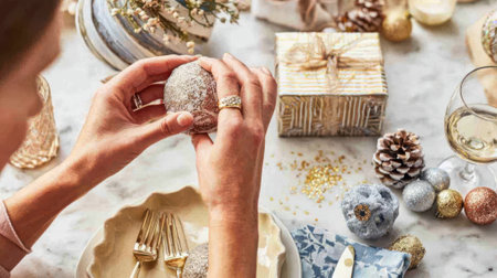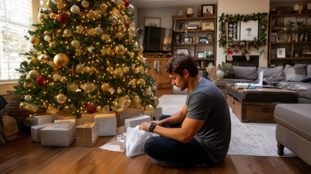 A cozy holiday scene featuring a person wrapping a gift with a sprig of pine, a cup of hot chocolate nearby, and a decorated Christmas tree in the background
