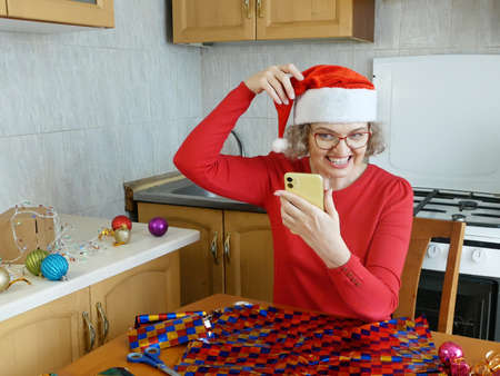 woman speaks on a mobile phone and wishes a happy new year to relatives and friends. at home in kitchen, smiling woman in santa helper hat with gift box, concept