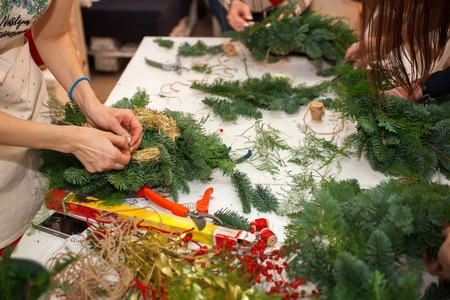 Craft workshop. Cropped shot of female florist using green fir tree twig to create Christmas interior decoration.