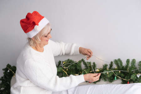 Positive senior female decorating the room for Christmas. lifestyle indoor, old age concept.