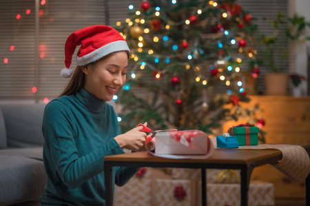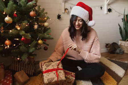 Merry Christmas! Happy young woman in santa hat opening christmas gift under christmas tree with lights in festive decorated modern room. Winter holidays preparations.