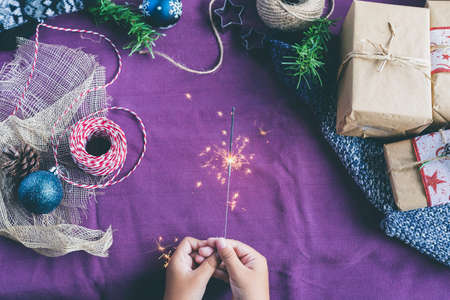 Child's hands holding a lit sparkler in a home Christmas setting Conceptual of christmas, family, shopping, celebrations