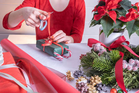 girl in red sweater wraps christmas presents and decorates them with ribbons and lollipops
