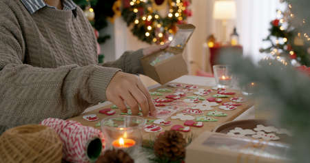 Asia woman happy enjoy fun make craft gift for Xmas night party sweet snack cooking recipe on table in good warm relax time. Cute smile gingerman bakery icing sugar glaze with red green white color.