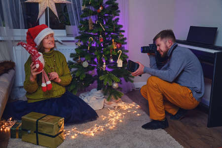 A man photographer with a camera conducts a photo session for a woman at the christmas tree on new year eve