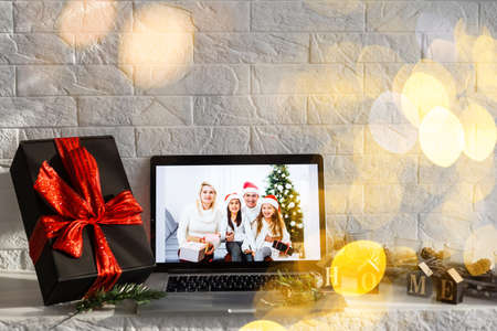 Christmas online holiday remote celebration X mas new year in lockdown coronavirus quarantine covid 19 new normal, social distance, remote communication, stay home vocation, Christmas party online.