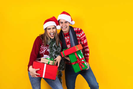 young Santa latin couple friends man and woman in red sweater Christmas hat hold present box with gift ribbon bow on yellow background in Mexico Latin America