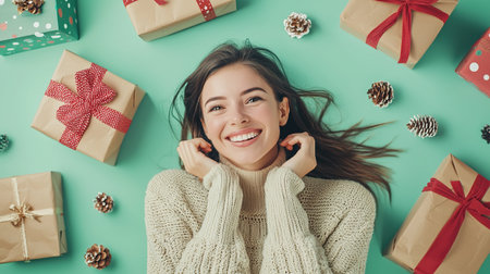 A man wearing a warm sweater beams with joy, surrounded by twinkling holiday lights and cheerful gift illustrations, embodying the spirit of Christmas.