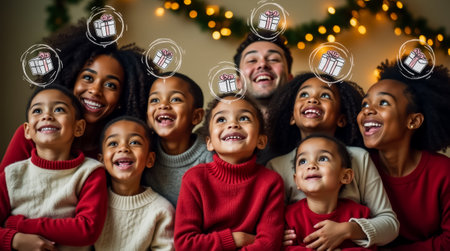 A diverse family celebrates the holiday season in a cozy living room, surrounded by decorations and laughter, sharing joyful moments with children.