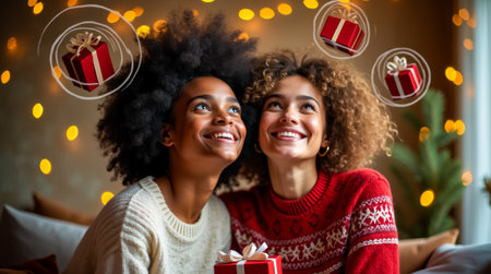 Two women share a moment of happiness, looking upward with smiles, immersed in thoughts of holiday gifts as colorful decorations surround them.