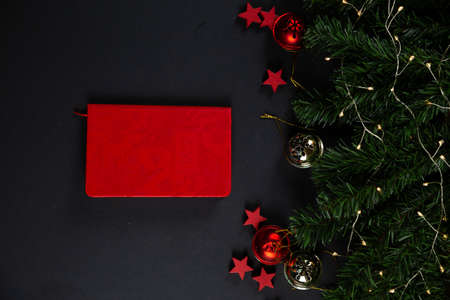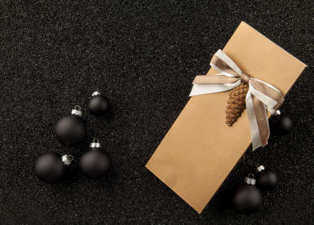 gift booklet with Christmas tree decorations on a black grainy background. flyer with ribbon on black grainy background
