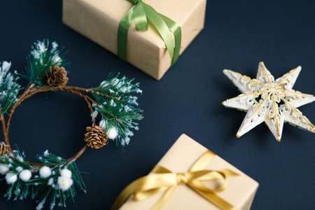 Christmas and New Year background with gifts, deer, stars and fir-trees, flat lay on a dark blue background, holiday greetings, concept of a winter background with free space