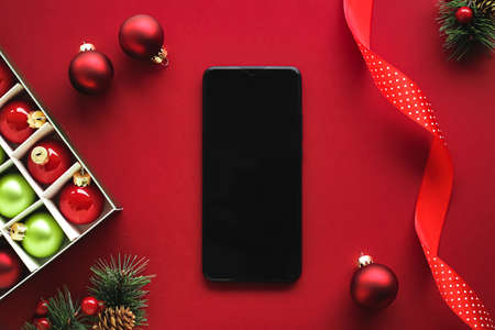 Christmas phone app and holiday message concept. Smartphone with blank black screen and xmas decoration on red background as flat lay mockup design