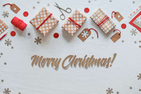 Text Merry Christmas. DIY Christmas gifts and handmade decorations. Plastic free low impact Xmas celebration. Gift boxes and tags in craft wrapping paper tied with red cotton cord.