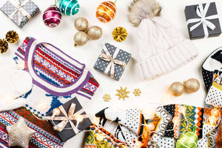 Christmas mood composition with Christmas sweater, hat, presents and lights. Winter concept flat lay