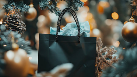 A sophisticated black gift bag stands out amid beautiful Christmas decorations, including pine cones and shimmering golden ornaments, capturing the essence of holiday joy.