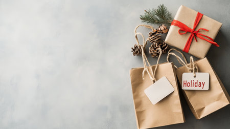 This upscale flat lay showcases beautifully wrapped holiday gifts alongside elegant shopping bags, perfect for festive arrangements.