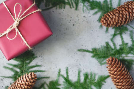Red Christmas gift box is tied of twine among winter decoration. Flat lay, top view.