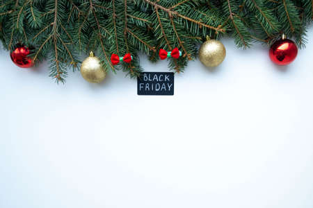 Black Friday big sale promotional sign on white background with fir branches and Christmas balls. Special discount offer. Advertising message. Holiday shopping. Top view, copy space for text.