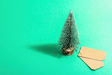 Christmas Sale concept on turquoise background. Decorative fir tree and paper tag.Traditional New Year symbol. A trendy hard light, dark shadow. Flat lay, mockup, template, copy space