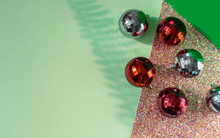 Disco mirror ball Christmas tree toy on a bright festive layered paper. Christmas and New Year holiday concept.