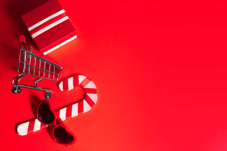 The text of the sale 12.12 on a letter board with a red gift box and Christmas candies, a credit card and a mini grocery cart. Design to promote the winter sale at the end of the year. Top view.