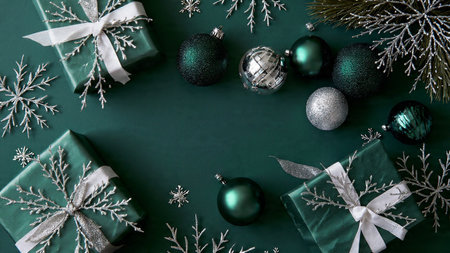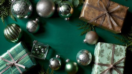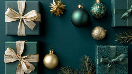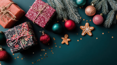 A beautiful flat lay of Christmas gifts, ornaments, gingerbread cookies, and pine branches on a dark green surface, creating a festive holiday atmosphere.