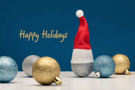 Happy Holidays. Christmas balls on a blue background, a silver ball in a red cap, studio shot, close-up.