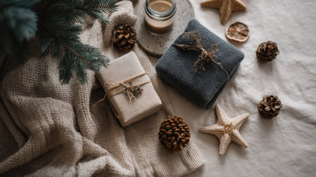 A warm and inviting holiday scene featuring neatly wrapped gifts, fragrant elements, and natural decorations, perfect for capturing the spirit of the season.