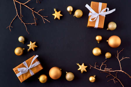 Flat lay christmas frame with gold christmas balls and gift box on a dark background