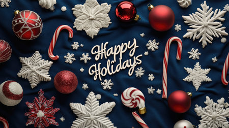 Enjoy a vibrant array of festive decorations for the holiday season, featuring ornaments, candies, and snowflakes on a rich blue fabric backdrop.