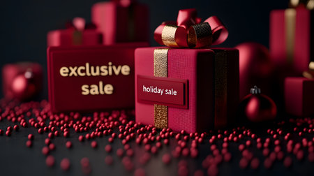 The image features a pile of luxurious red and gold wrapped gifts arranged artistically. The background is dark, enhancing the vibrant colors. A festive atmosphere prevails.