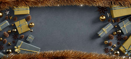 Christmas frame top border made of Xmas gift boxes, gold baubles, snowflakes on dark blue background. Flat lay, top view, copy space. Elegant Christmas card design.