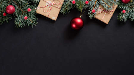 Christmas tree with red decorations and gifts on black background. Flat lay, top view, overhead. Christmas banner mockup.