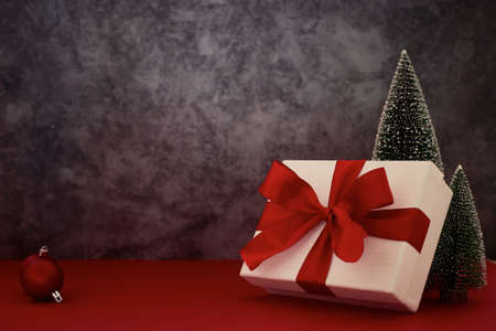 Christmas red ball and gifts box on a white background. Holidays christmas background. Copy space for text or design.