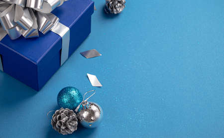 christmas flatly photo on blue background. different new years decorations: cones, Christmas trees, gifts, snowflakes, toys. Copyspace.