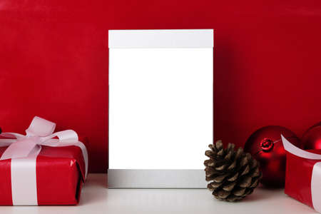 Blank silver photo frame mockup template and christmas decoration on red blackground.