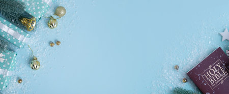 Gift boxes and Christmas decor with snow and Holy Bible. Xmas holydays banner with copy space