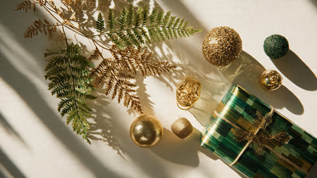 Luxury winter background featuring green matte surfaces and shimmering gold sparkle.