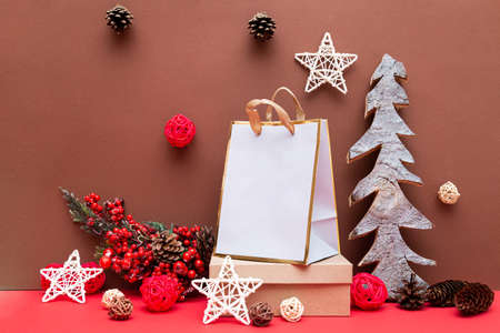 Christmas composition with gifts and a wooden Christmas tree, pine cones and stars on a red-brown background copy space. Christmas card