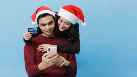 Young Asian couple lover wearing Santa Claus hat.Shopping online with credit card and smartphone isolated on blue background in studio shot.Christmas celebration of lover concept.